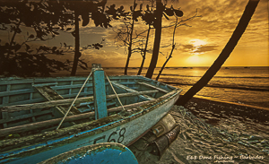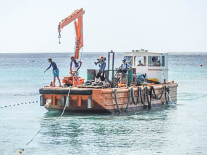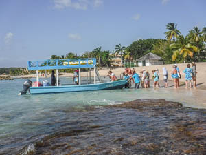 Passengers boarding the Glass bottomed boat, skippered by 'The General' . Photographed in shallow water by the beach near the old watersport centre. |