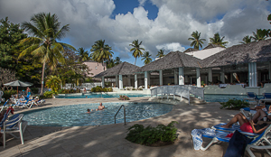 The pool and restaurant at Waves on the opposite side of the resort to the main sea view side |